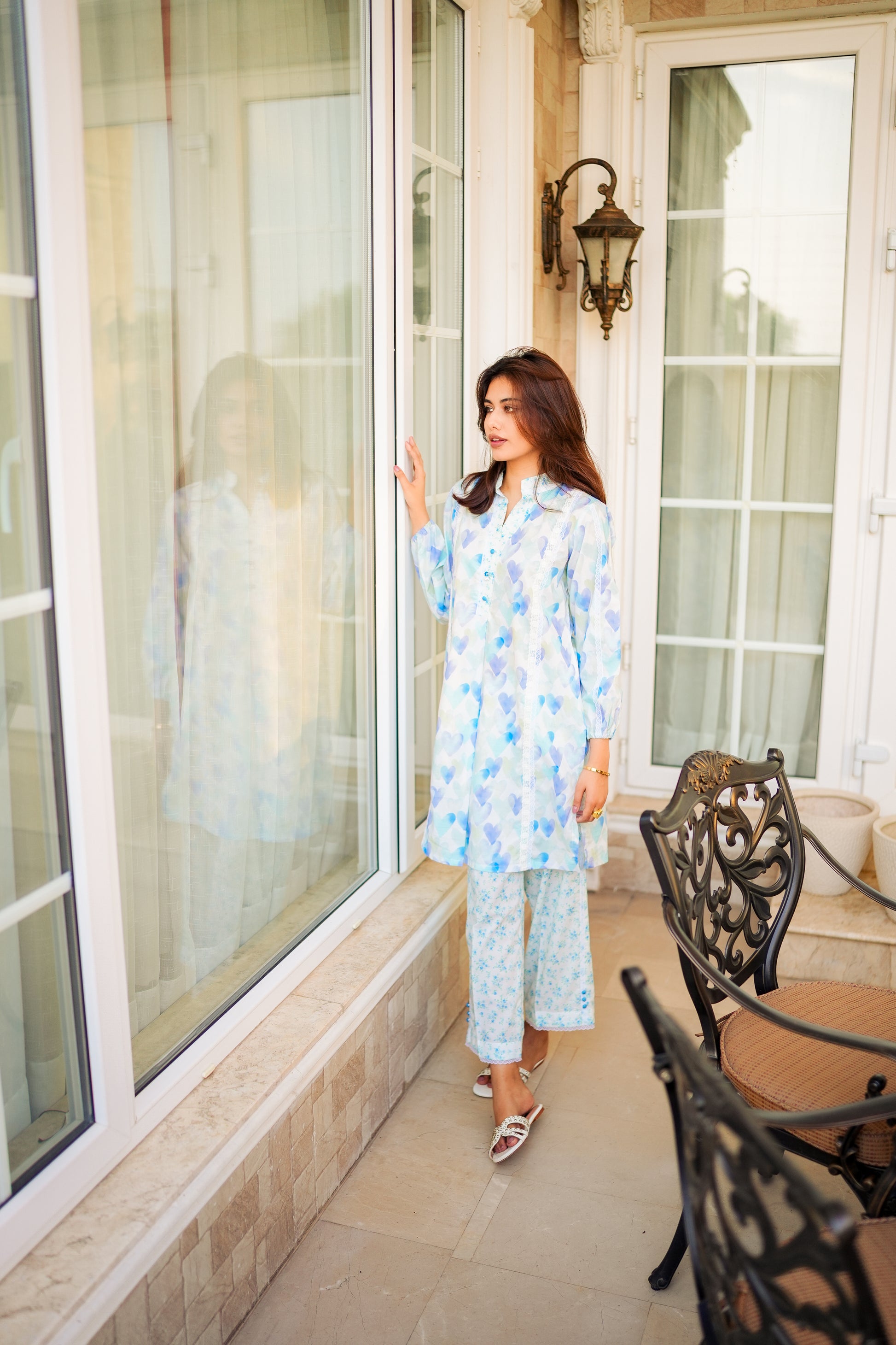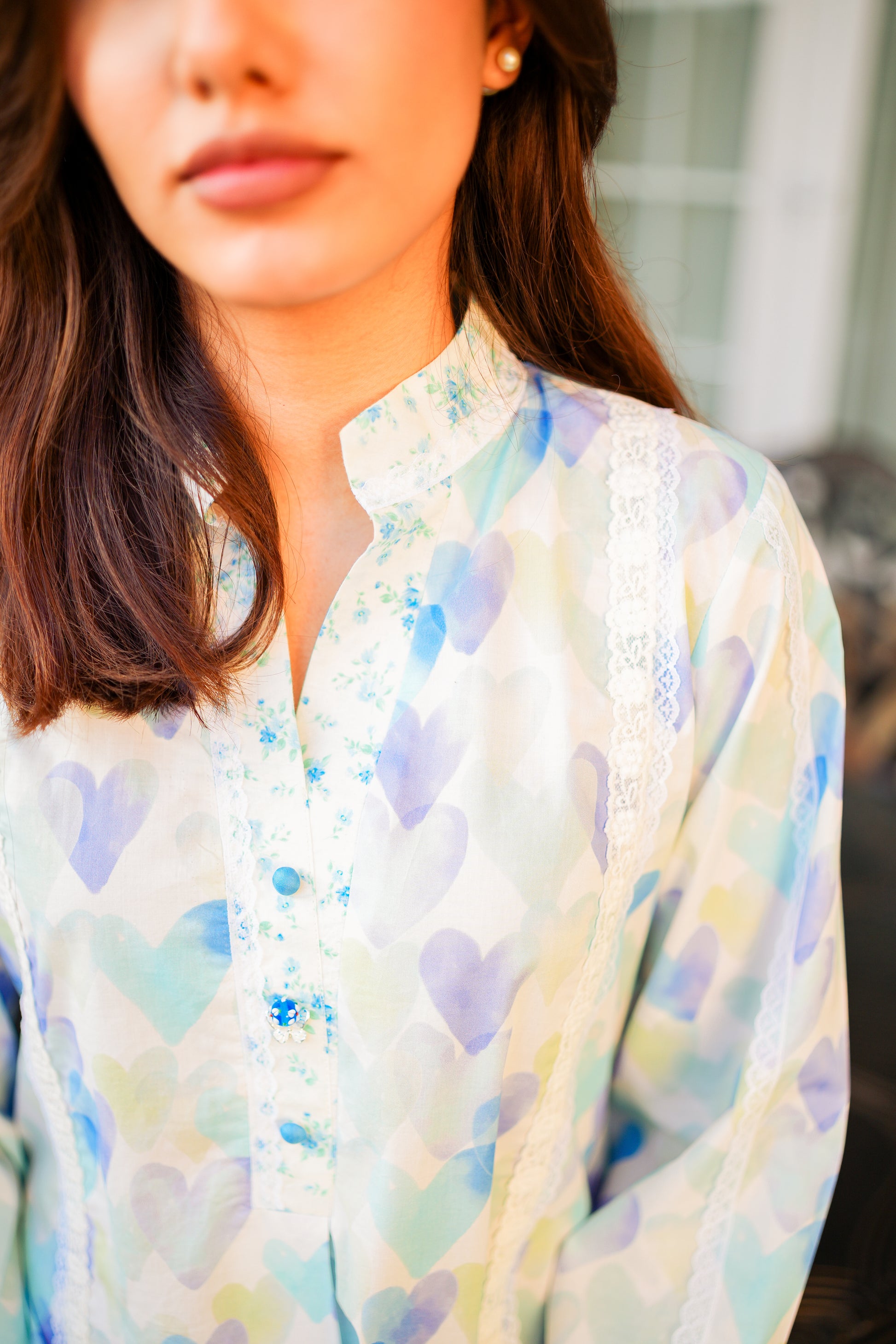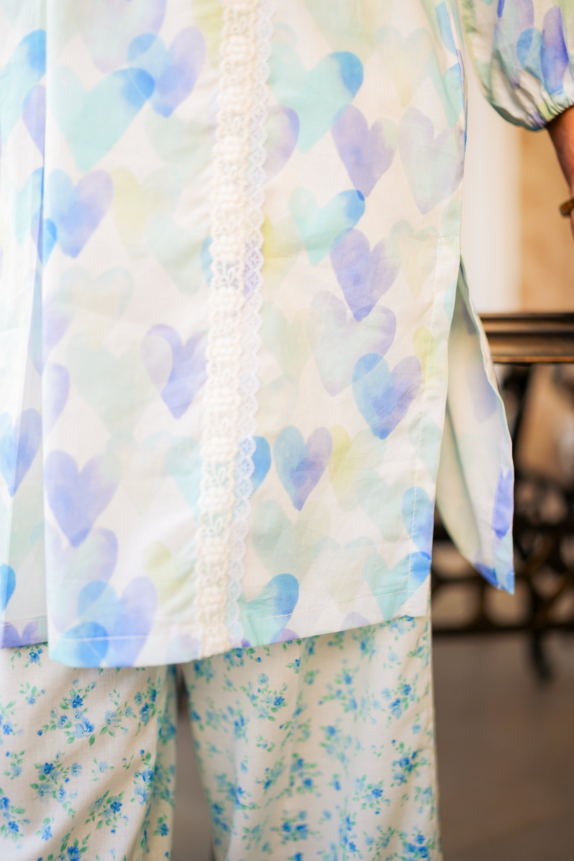Our Cupid Garden coord set from the Print Parade collection features a charming heart-print top with a box-pleated front, a floral neckline, elasticated sleeves, and delicate net lace details. Paired with matching floral-printed culottes, it's the ideal blend of comfort and chic for a fun girls' day out.