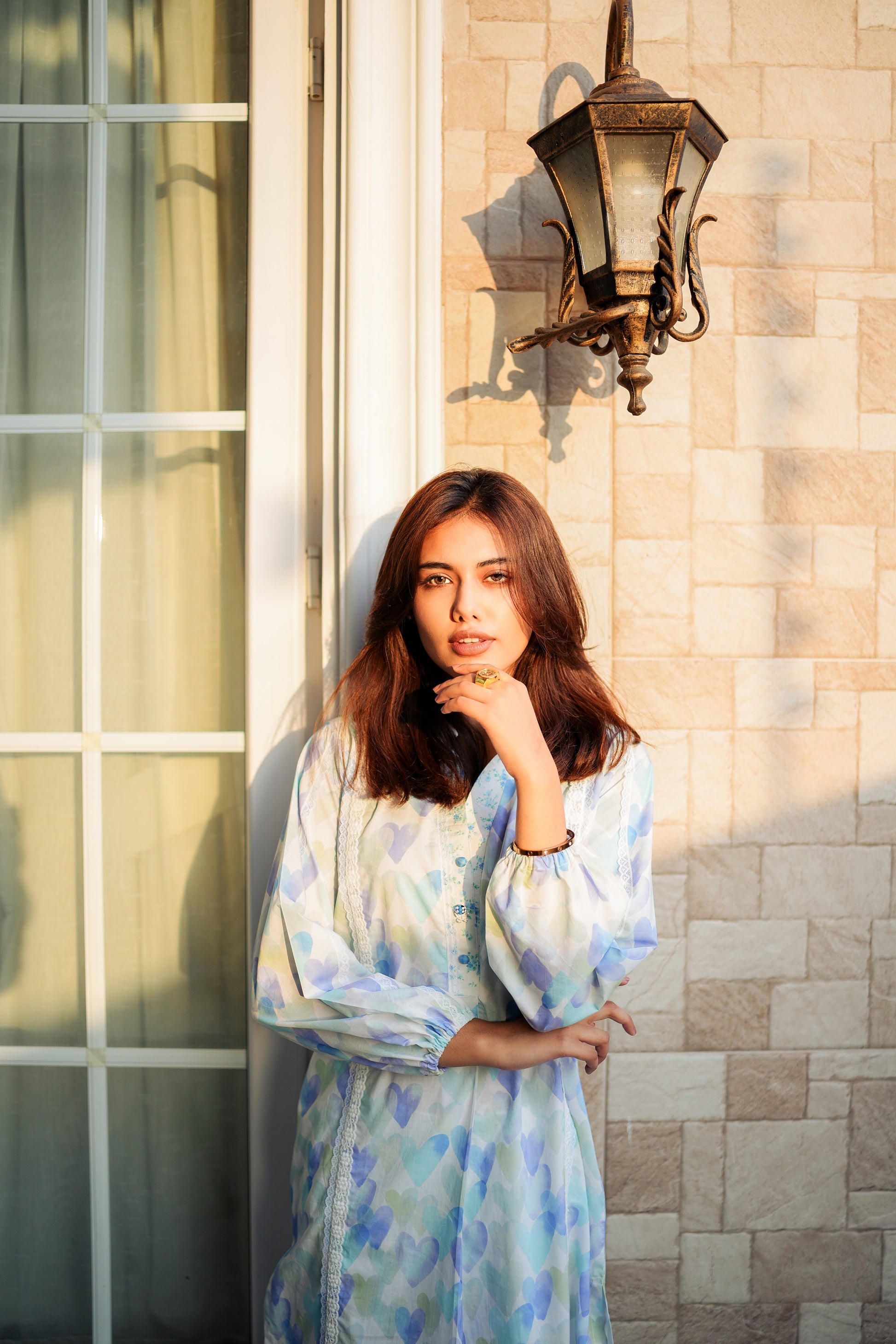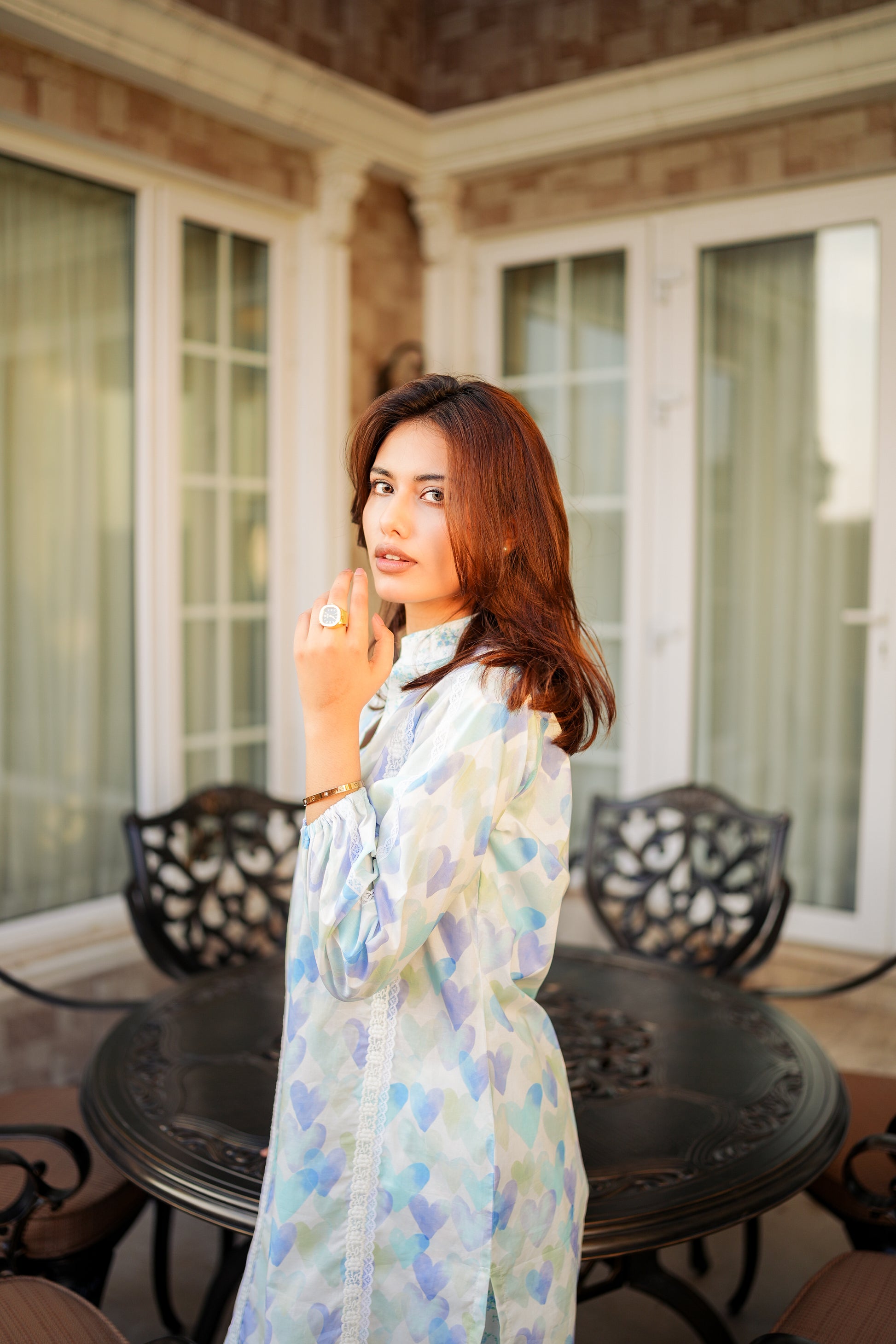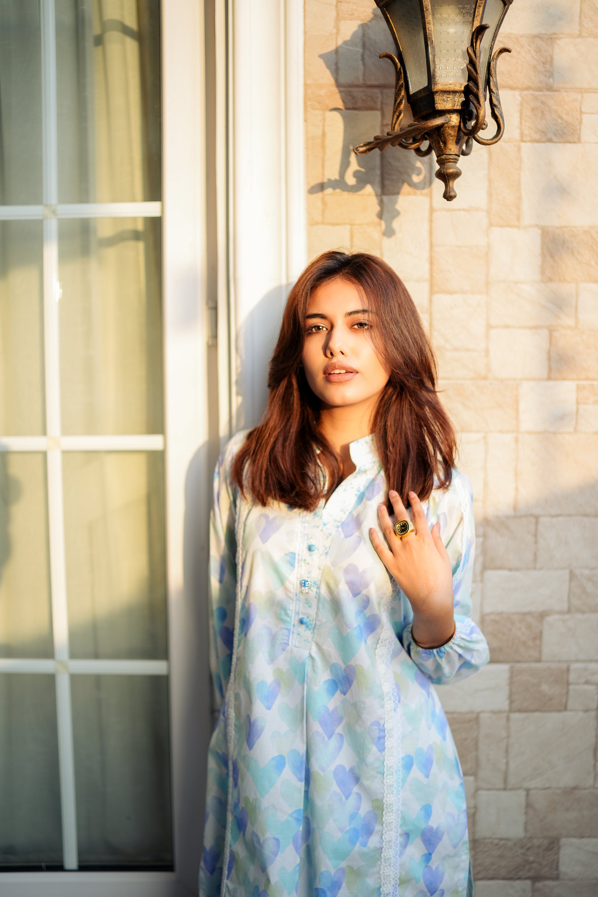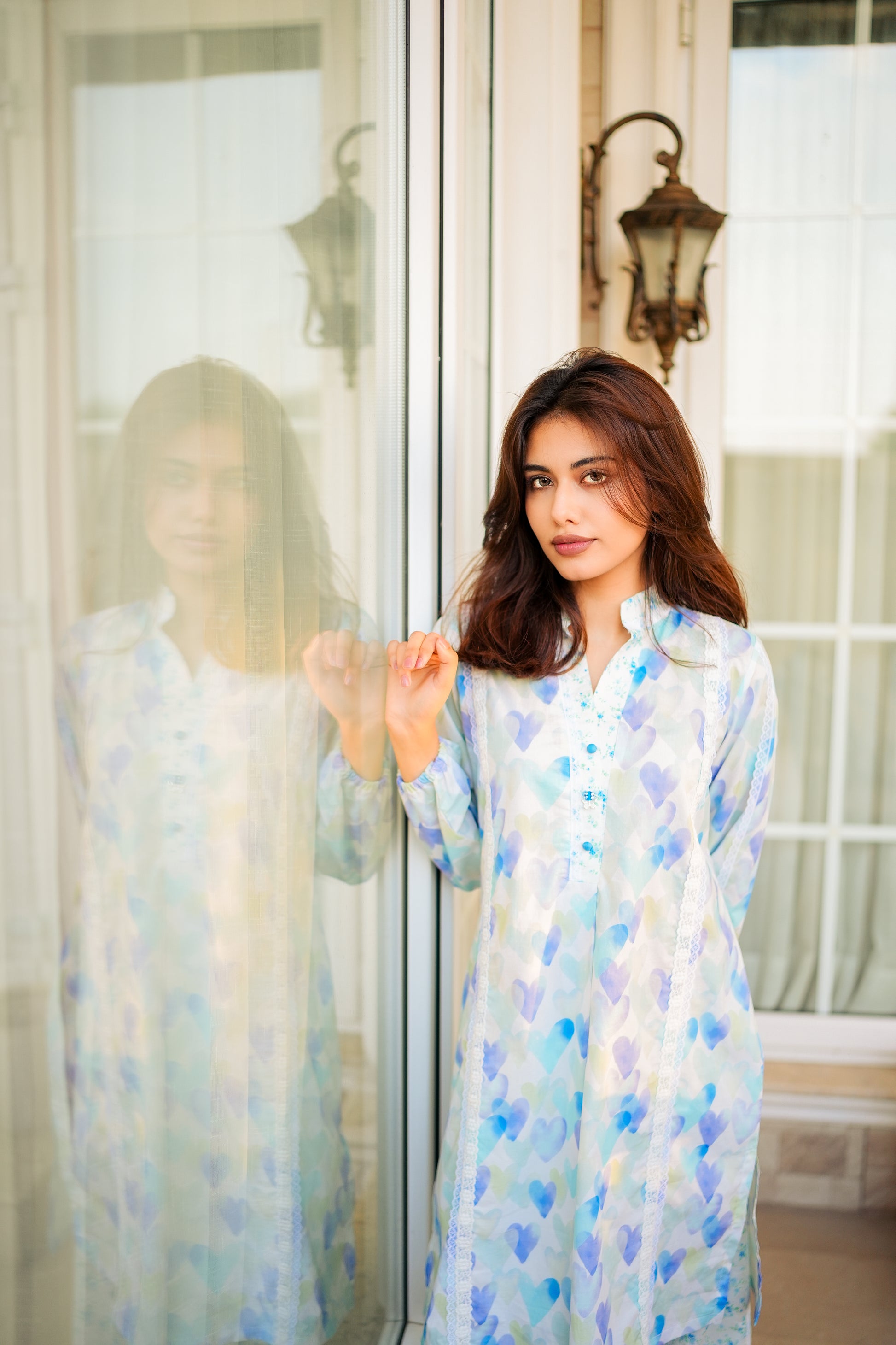Our Cupid Garden coord set from the Print Parade collection features a charming heart-print top with a box-pleated front, a floral neckline, elasticated sleeves, and delicate net lace details. Paired with matching floral-printed culottes, it's the ideal blend of comfort and chic for a fun girls' day out.
